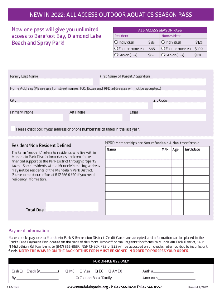 NEW IN 2022: ALL ACCESS OUTDOOR AQUATICS SEASON PASS Now one pass will give you unlimited access to Barefoot Bay, Diamond Lake Beach and Spray Park! Family Last NameALLACCESS SEASON PASS ResidentNonresidentIndividual$85Individual$125Four