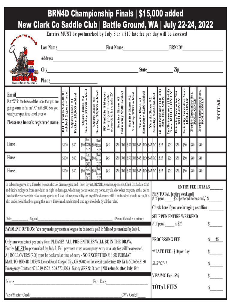 BRN4D Championship Finals | $15,000 added New Clark Co Saddle Club | Battle Ground, WA | July 2224, 2022 Entries MUST be postmarked by July 8 or a $10 late fee per day will be assessedLast Name___First