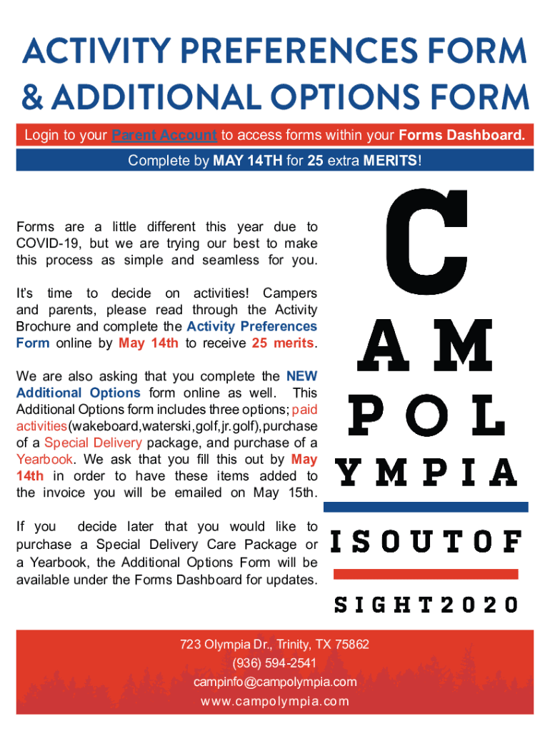 ACTIVITY PREFERENCES FORM & ADDITIONAL OPTIONS FORM Login to your Parent Account to access forms within your Forms Dashboard. Complete by MAY 14TH for 25 extra MERITS! Forms are a little different