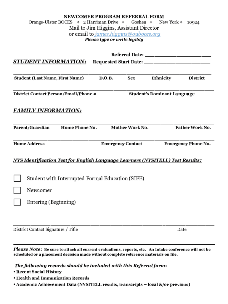 NEWCOMER PROGRAM REFERRAL FORM Orange Ulster BONES 2 Harriman Drive Goshen New York 10924Mail to Jim Higgins, Assistant Director or email to james.higgins@ouboces.org Please type or write legiblyReferral