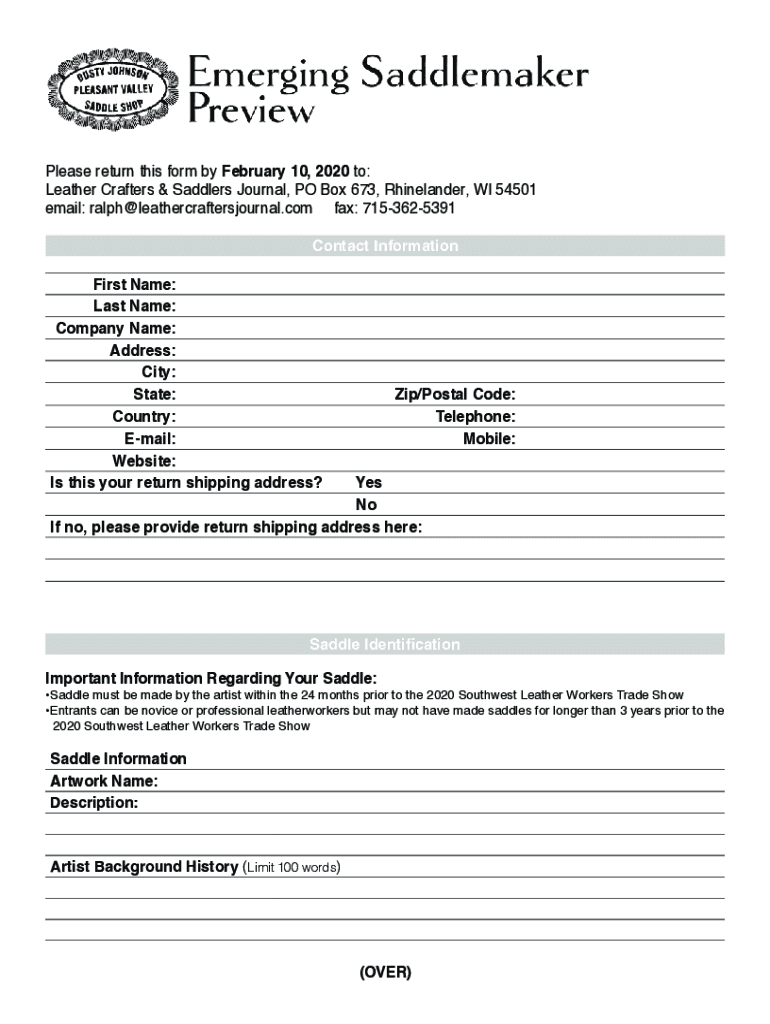 Please return this form by February 10, 2020, to: Leather Craters & Saddlers Journal, PO Box 673, Rhinelander, WI 54501 email: ralph@leathercraftersjournal.com fax: 7153625391 Contact Information
