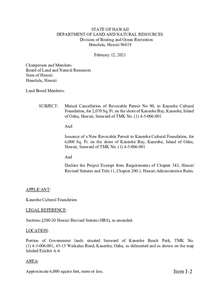 STATE OF HAWAII DEPARTMENT OF LAND AND NATURAL RESOURCES Division of Boating and Ocean Recreation Honolulu, Hawaii 96819 February 12, 2021, Chairperson and Members Board of Land and Natural Resources
