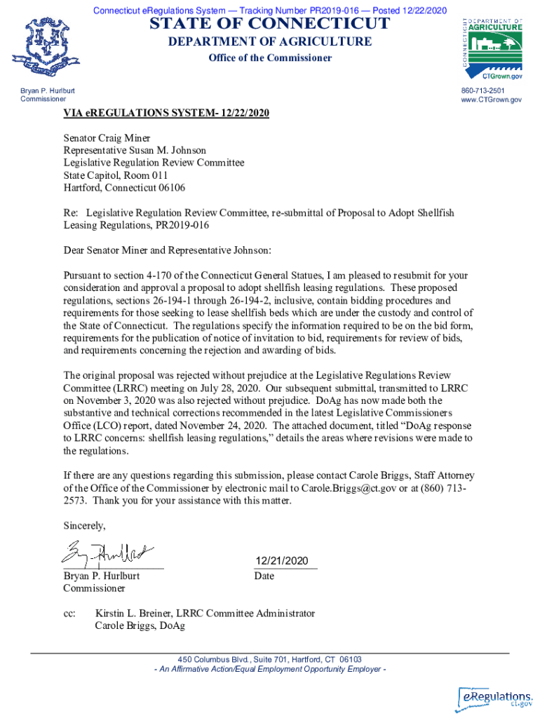 Connecticut's regulations System Tracking Number PR2019016 Posted 12/22/2020STATE OF CONNECTICUT DEPARTMENT OF AGRICULTURE Office of the Commissioner Bryan P. Herbert Commissioner8607132501 www.CTGrown.govVIA