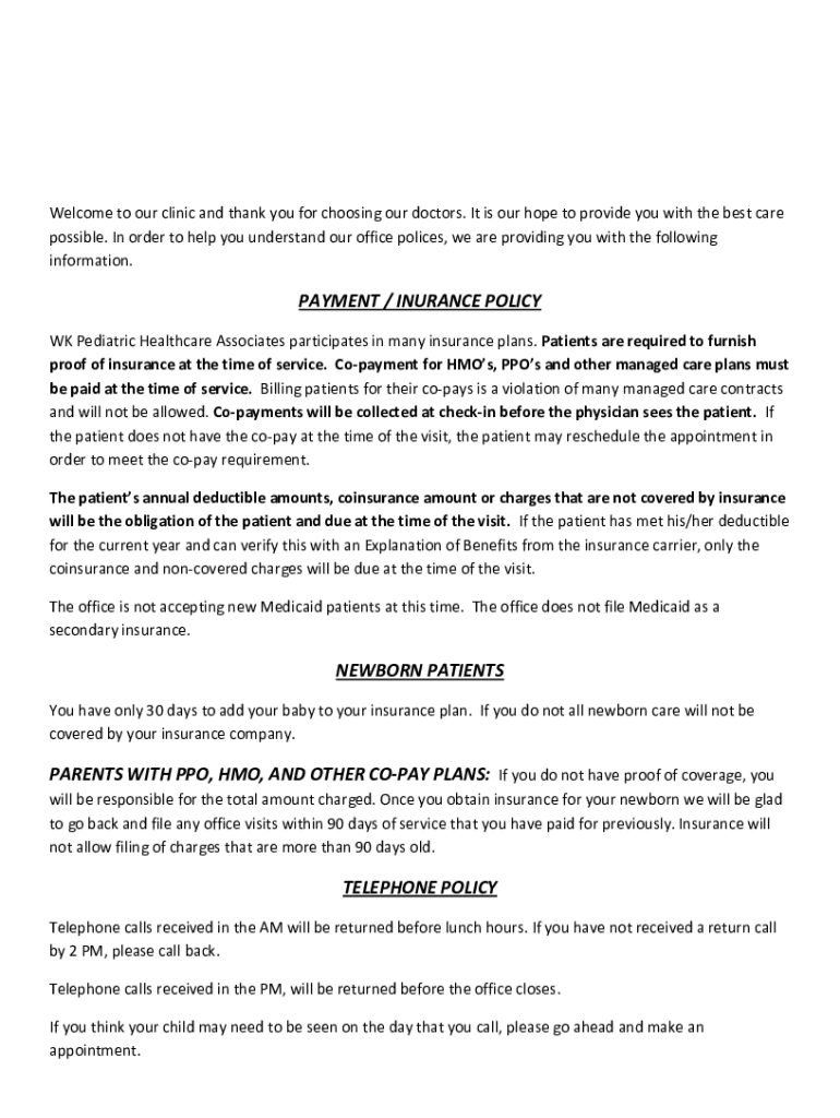 Welcome to our clinic, and thank you for choosing our doctors. It is our hope to provide you with the best care possible. In order to help you understand our office polices, we are providing you with