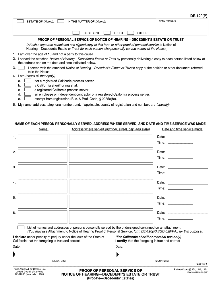 To keep other people from seeing what you entered on your form, please press the Clear This Form button at the end of the form when finished. DE-120(P) ESTATE OF (Name): CASE NUMBER: IN THE MATTER