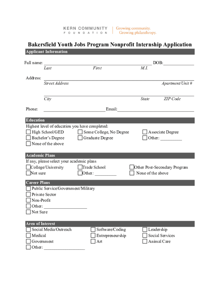 Bakersfield Youth Jobs Program Nonprofit Internship Program Overview Thank you for your interest in the Bakersfield Youth Jobs Program Nonprofit Internship! The Nonprofit Internship Program is a 15week,
