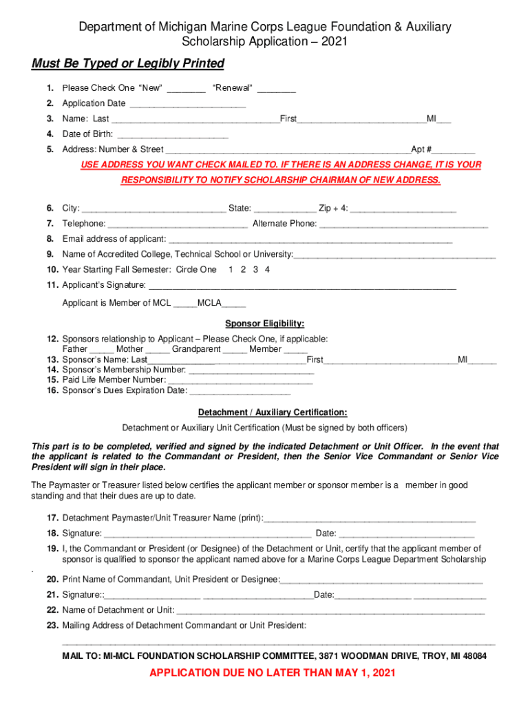 Department of Michigan Marine Corps League Foundation & Auxiliary Scholarship Application 2021 Must Be Typed or Legibly Printed 1. Please Check One New ___ Renewal ___ 2. Application Date ___ 3. Name:
