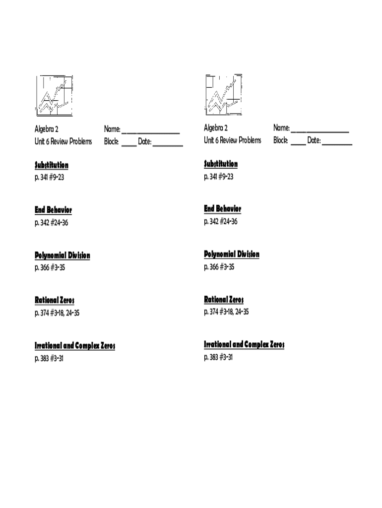 Algebra 2 Unit 6 Review ProblemsName: ___ Block: ___ Date: ___Algebra 2 Unit 6 Review ProblemsName: ___ Block: ___ Date: ___Substitution p. 341 #923Substitution p. 341 #923End Behavior p. 342 #2436End