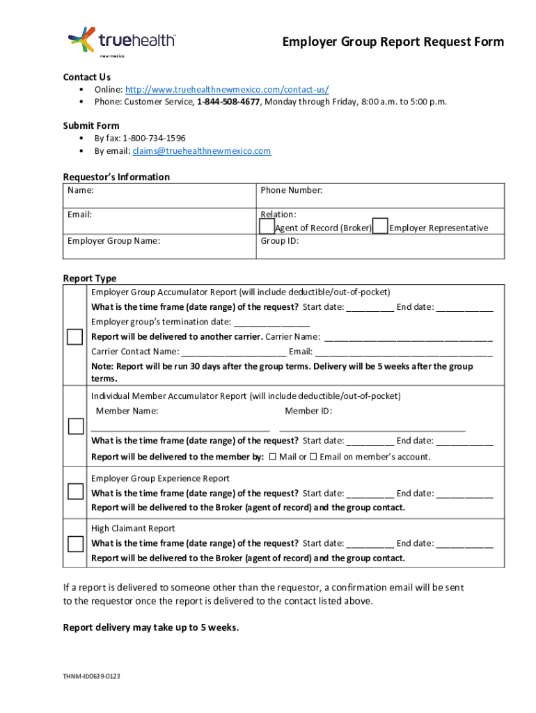 Employer Group Report Request Form Contact Us Online: http://www.truehealthnewmexico.com/contactus/ Phone: Customer Service, 18445084677, Monday through Friday, 8:00 a.m. to 5:00 p.m. Submit Form.