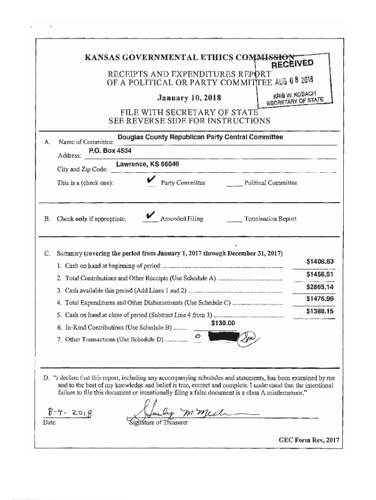 KANSAS GOVERNMENTAL ETHICS COlllrllllu V\'Reels\'.RECEIPTS AND EXPENDITURES REP DRT, OF A POLITICAL OR PARTY COMMITTEE AUG 0,8 201S!RIS W. KOB ACH SECRETARY OF STATE January 10,2018FILE WITH SECRETARY