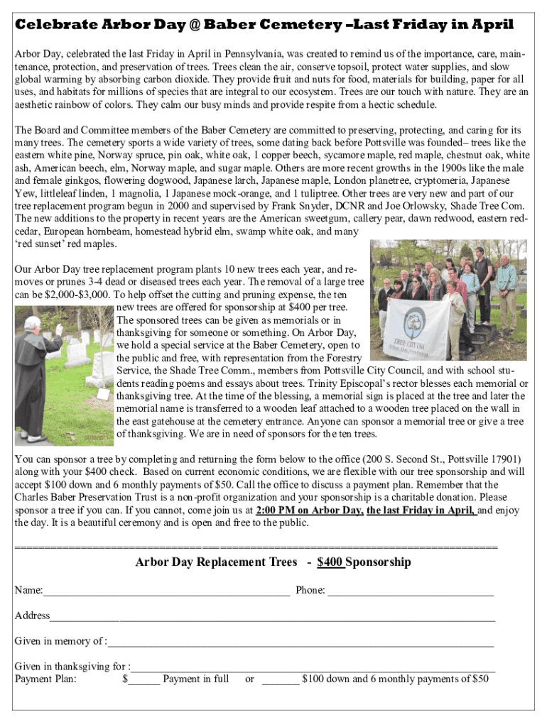 Celebrate Arbor Day @ Baker Cemetery Last Friday in April Arbor Day, celebrated the last Friday in April in Pennsylvania, was created to remind us of the importance, care, maintenance, protection,