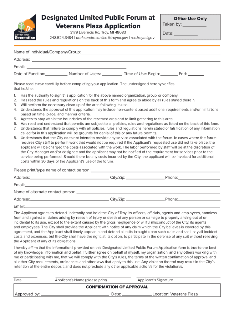 Designated Limited Public Forum at Veterans Plaza Application 3179 Liverpool Rd, Troy, MI 48083 248.524.3484 | parksandreconline@troymi.gov | rec. Troy me. Office Use Only Taken by:Date:Name of Individual/Company/Group: