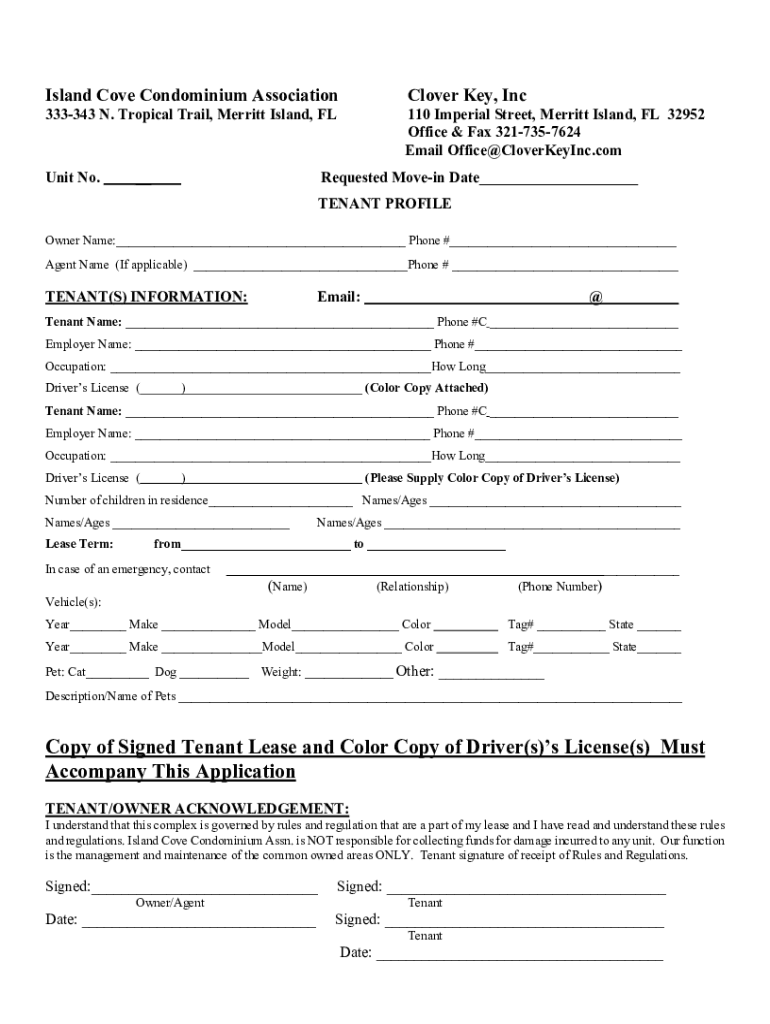 To fill out Island Cove Condominiums Merritt forms, individuals must provide information about their unit, occupancy status, and other relevant details.