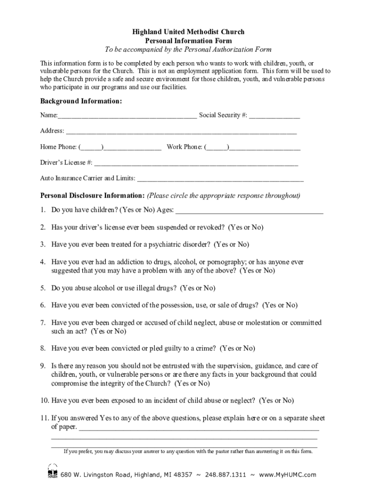 Highland United Methodist Church Personal Information Form To be accompanied by the Personal Authorization Form This information form is to be completed by each person who wants to work with children,