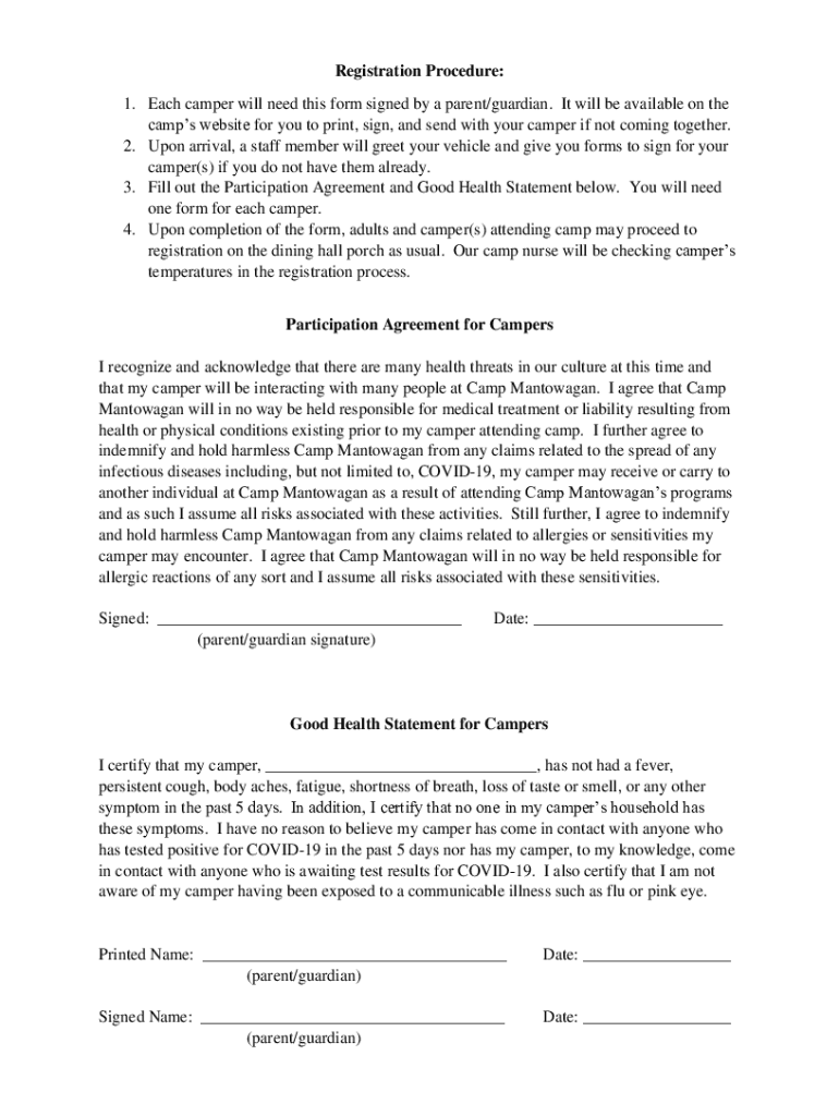 Registration Procedure: 1. Each camper will need this form signed by a parent/guardian. It will be available on the camps' website for you to print, sign, and send with your camper if not coming together.