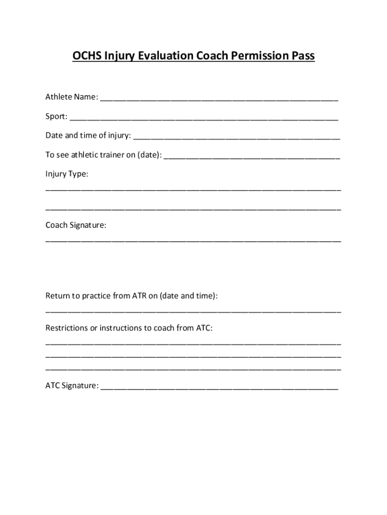 OCS Injury Evaluation Coach Permission Pentathlete Name: ___Sport: ___Date and time of injury: ___To see athletic trainer on (date): ___Injury Type:______Coach Signature:___Return to practice from