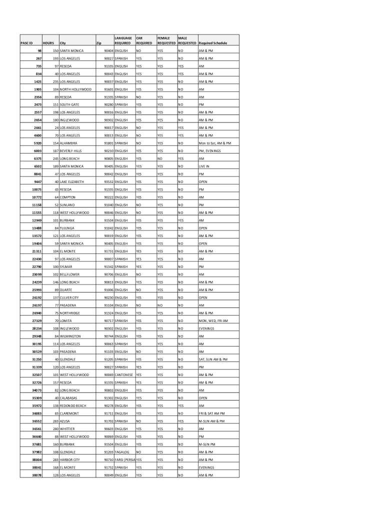 REQUESTED Required Schedule150 SANTA MONICA90404 ENGLISHNOYESNOAM & PM193 LOS ANGELES90027 SPANISHYESYESNOAM & PM73597 RESEDA91335 ENGLISHYESYESYESAM83440