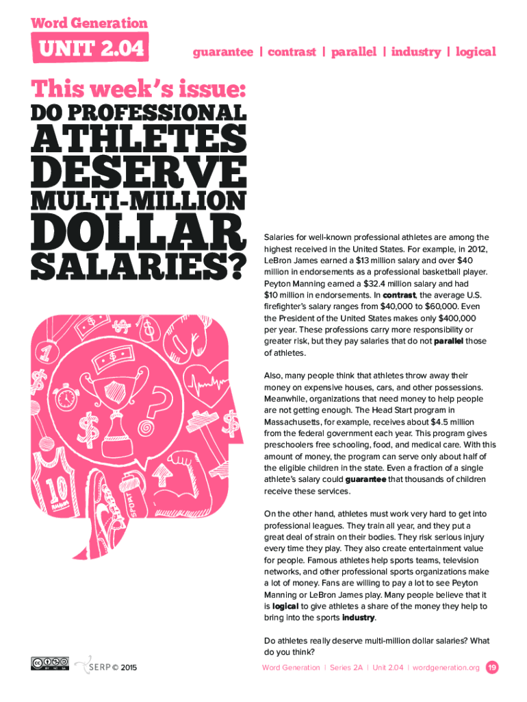 Word Generation UNIT 2.04guarantee | contrast | parallel | industry | logicalThis weeks issue:Salaries for well-known professional athletes are among the highest received in the United States. For