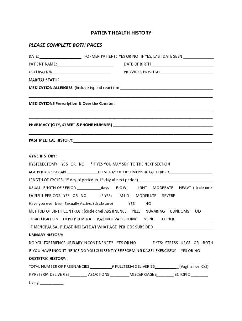 PATIENT HEALTH HISTORY PLEASE COMPLETE BOTH PAGES DATE: ___ FORMER PATIENT: YES OR NO IF YES, LAST DATE SEEN PATIENT NAME:DATE OF BIRTH___OCCUPATION___PROVIDER HOSPITAL ___MARITAL STATUS MEDICATION