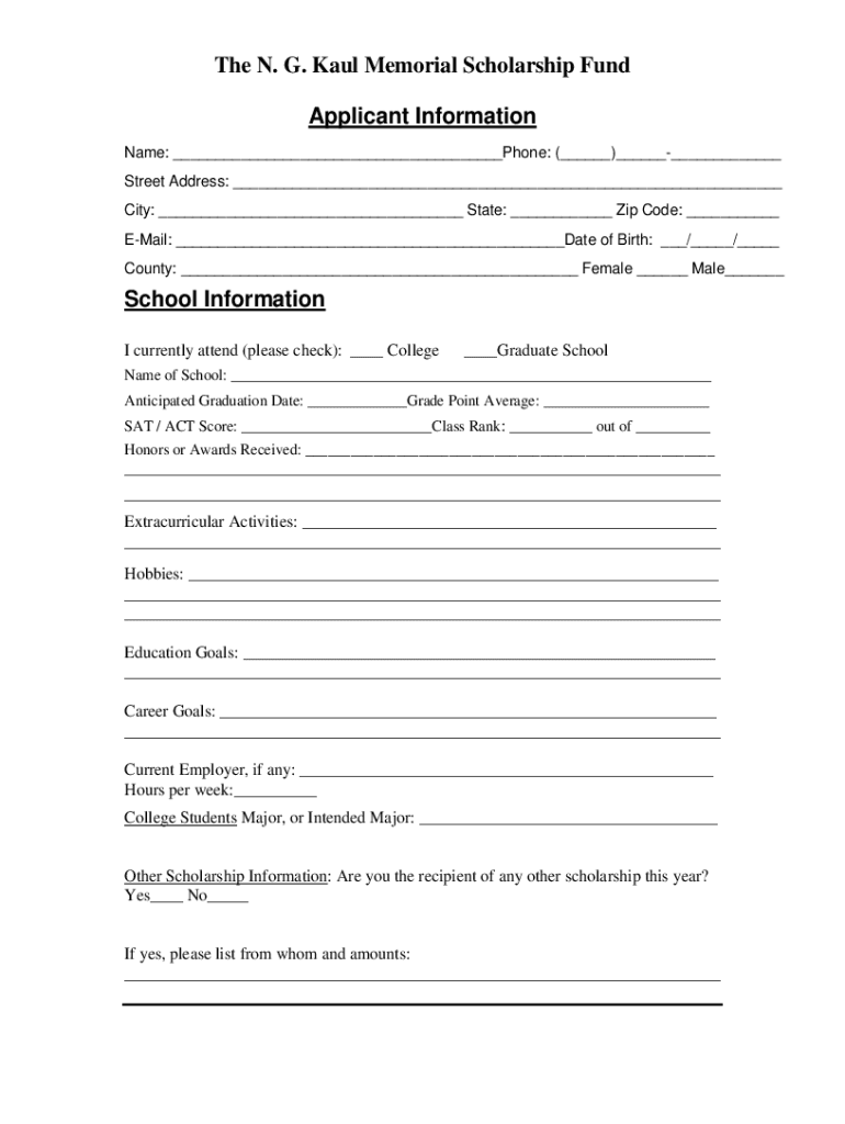 Get the free The N. G. Kaul Memorial Scholarship Fund Applicant ...