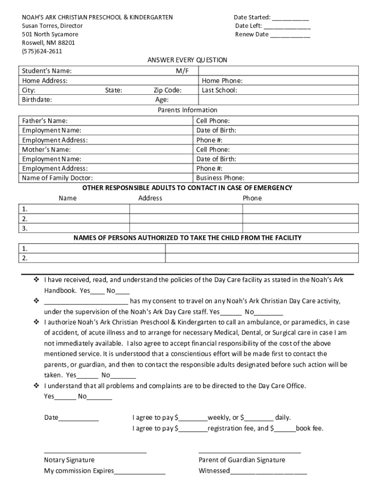 NOAH ARK CHRISTIAN PRESCHOOL & KINDERGARTEN Susan Torres, Director 501 North Sycamore Roswell, NM 88201 (575)6242611Date Started: ___ Date Left: ___ Renew Date ___ANSWER EVERY QUESTION Students Name: