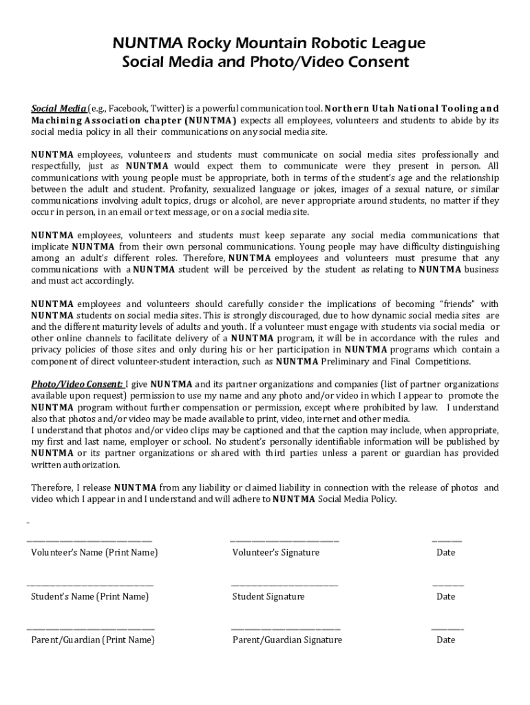 NUN TMA Rocky Mountain Robotic League Social Media and Photo/Video Consent Social Media (e.g., Facebook, Twitter) is a powerful communication tool. Northern Utah National Tooling and Machining Association