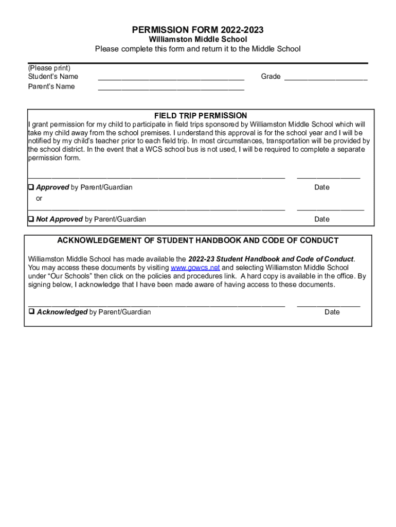 PERMISSION FORM 20222023 Williamson Middle School Please complete this form and return it to the Middle School (Please print) Students Name Parents Name___ ___Grade ___FIELD TRIP PERMISSION I grant
