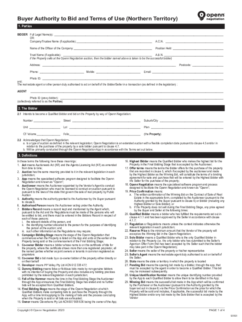 Buyer Authority to Bid and Terms of Use (Northern Territory) 1. Parties BIDDERFull Legal Name(s): ___OR:Company/Trustee Name (if applicable):___A. C.N. ___Name of the Officer of the Company:___Position