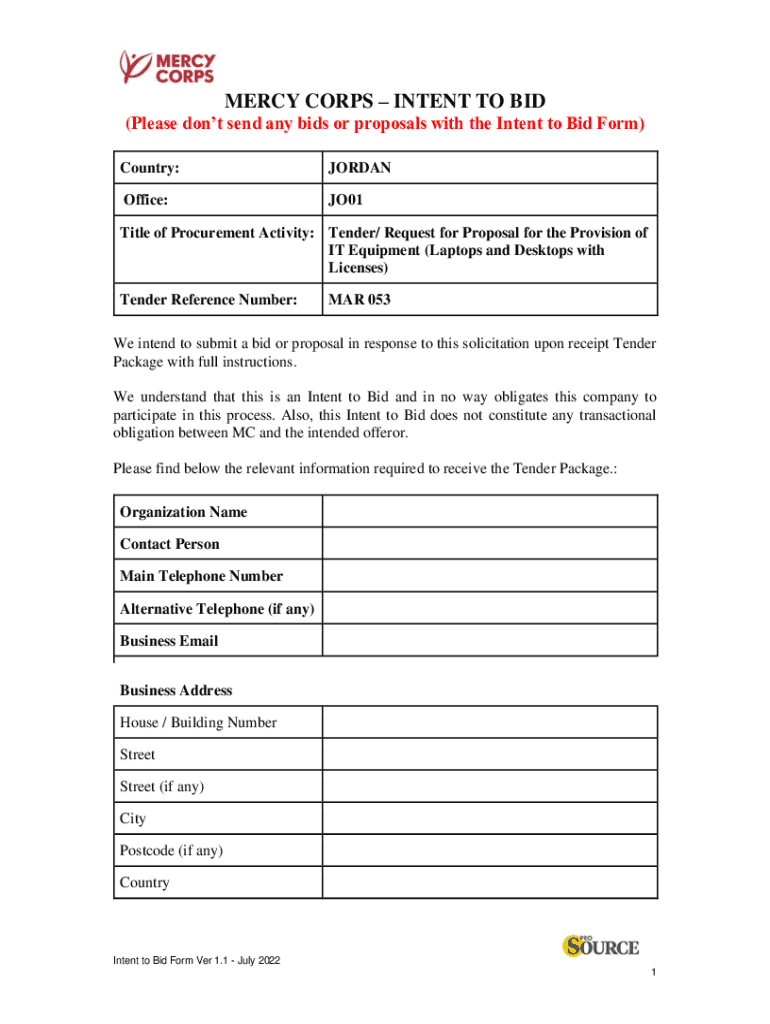 MERCY CORPS INTENT TO BID (Please don't send any bids or proposals with the Intent to Bid Form) Country:JORDANOffice:JO01Title of Procurement Activity: Tender/ Request for Proposal for the Provision