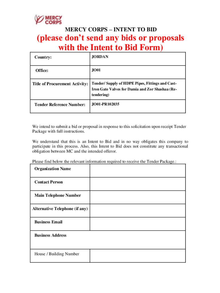 MERCY CORPS INTENT TO BID(please don't send any bids or proposals with the Intent to Bid Form) Country:JORDANOffice:JO01Title of Procurement Activity: Tender/ Supply of HDPE Pipes, Fittings and Caution