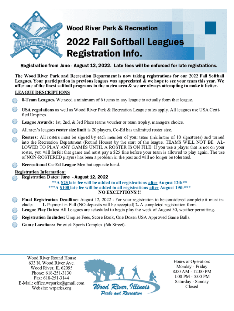 Wood River Park & Recreation2022 Fall Softball Leagues 2011 Registration Info. Registration from June August 12, 2022. Late fees will be enforced for late registrations. The Wood River Park and Recreation