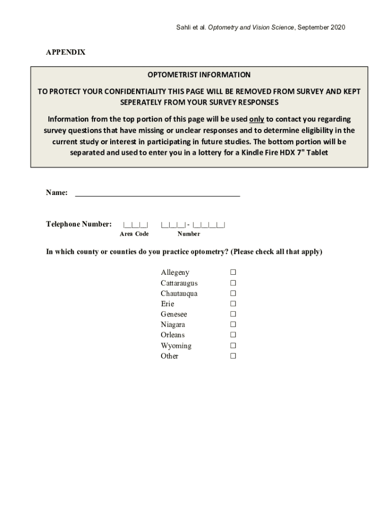 Sale et al. Optometry and Vision Science, September 2020APPENDIXOPTOMETRIST INFORMATION TO PROTECT YOUR CONFIDENTIALITY THIS PAGE WILL BE REMOVED FROM SURVEY AND KEPT SEPARATELY FROM YOUR SURVEY RESPONSES