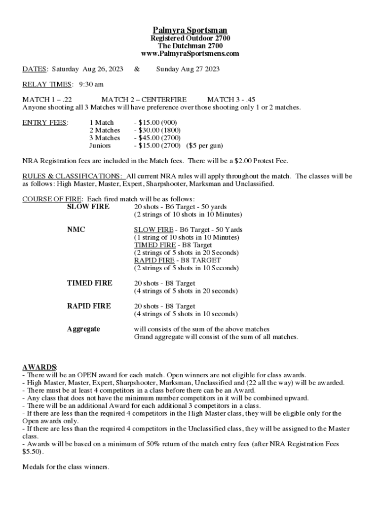 Palmyra Sportsman Registered Outdoor 2700 The Dutchman 2700 www.PalmyraSportsmens.com DATES: Saturday Aug 26, 2023&Sunday Aug 27 2023RELAY TIMES: 9:30 am MATCH 1 .22 MATCH 2 CENTERLINE MATCH 3 .45