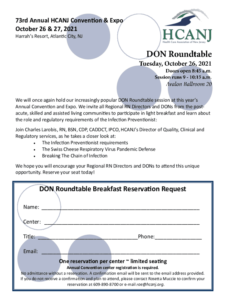 73rd Annual HCA NJ Convention & Expo October 26 & 27, 2021 Hurrahs Resort, Atlantic City, We will once again hold our increasingly popular DON Roundtable session at this year's Annual Convention and