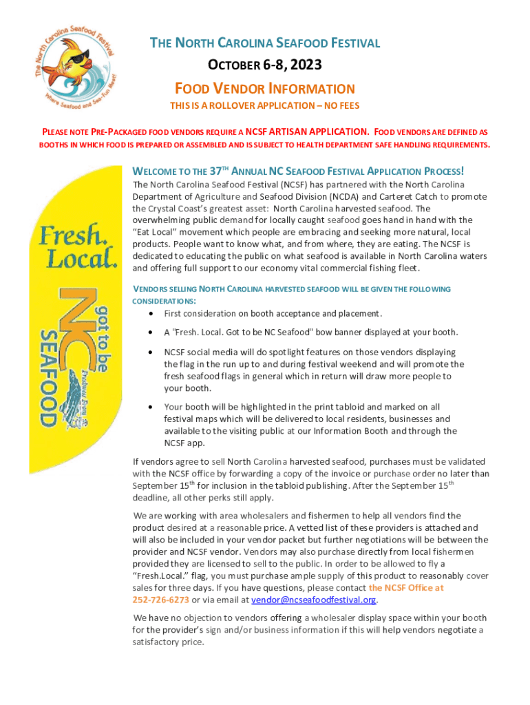 THE NORTH CAROLINA SEAFOOD FESTIVAL OCTOBER 68, 2023FOOD VENDOR INFORMATION THIS IS A ROLLOVER APPLICATION NO FEES PLEASE NOTE PREPACKAGED FOOD VENDORS REQUIRE A CSF ARTISAN APPLICATION. FOOD VENDORS