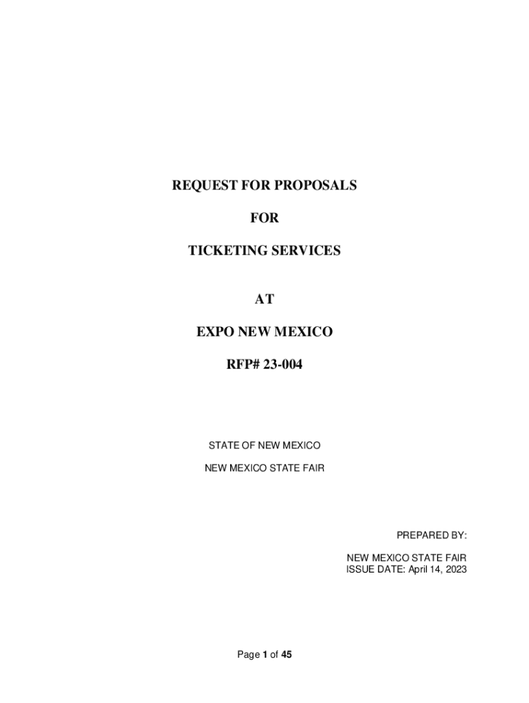 REQUEST FOR PROPOSALS FOR TICKETING SERVICE SAT EXPO NEW MEXICO RFP# 23004STATE OF NEW MEXICO STATE FAIRPREPARED BY: NEW MEXICO STATE FAIR ISSUE DATE: April 14, 2023Page 1 of 45TABLE OF CONTENTS 2023