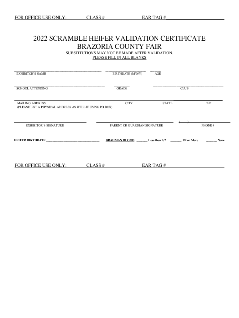 FOR OFFICE USE ONLY:CLASS #EAR TAG #___2022 SCRAMBLE HEIFER VALIDATION CERTIFICATE