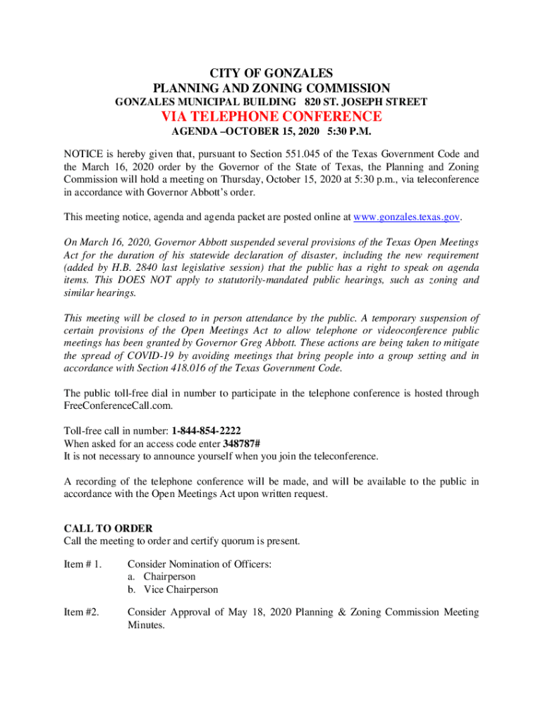 CITY OF GONZALES PLANNING AND ZONING COMMISSION GONZALES MUNICIPAL BUILDING 820 ST. JOSEPH STREET TELEPHONE CONFERENCE AGENDA OCTOBER 15, 2020 5:30 P.M. NOTICE is hereby given that, pursuant to Section