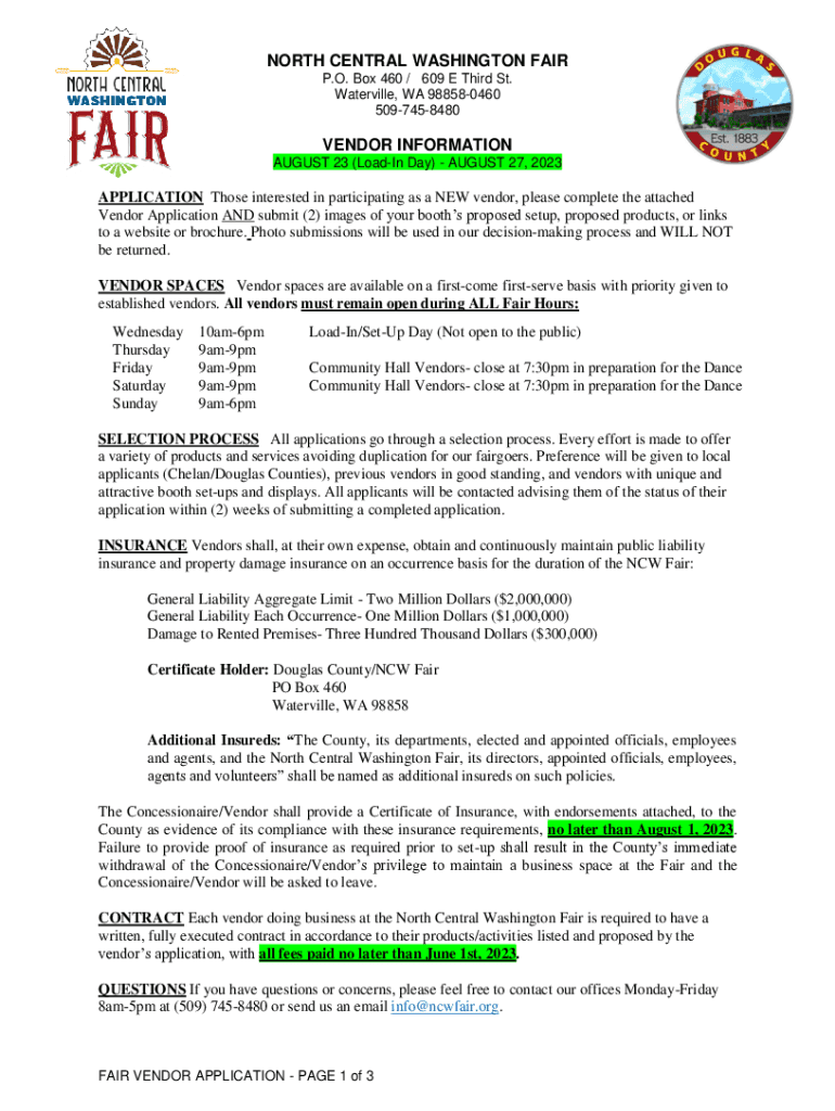 NORTH CENTRAL WASHINGTON FAIR P.O. Box 460 / 609 E Third St. Waterville, WA 988580460 5097458480VENDOR INFORMATION AUGUST 23 (Loading Day) AUGUST 27, 2023APPLICATION Those interested in participating