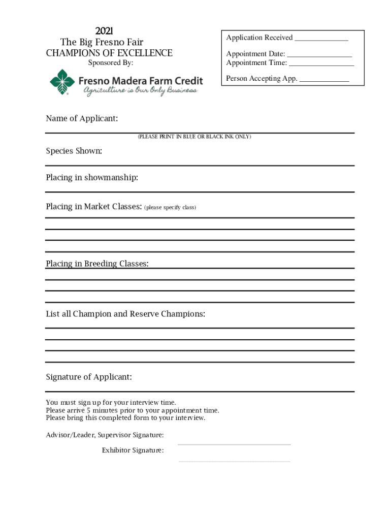 2021 The Big Fresno Fair CHAMPIONS OF EXCELLENCE Sponsored By:Application Received ___ Appointment Date: ___ Appointment Time: ___ Person Accepting App. ___Name of Applicant: (PLEASE PRINT IN BLUE