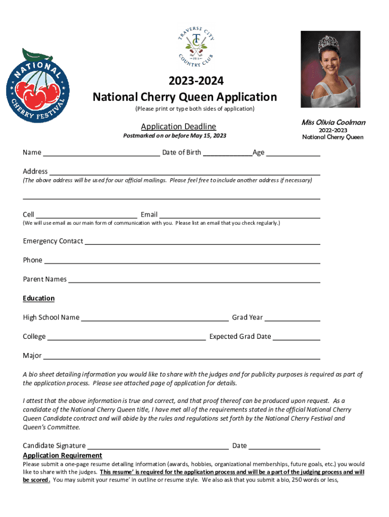 20232024 NationalCherryQueenApplication (Pleaseprintortypebothsidesofapplication) Miss Olivia CoolmanApplicationDeadline20222023 National Cherry QueenPostmarkedonorbeforeMay15,2023 Name AddressDateofBirth___Age