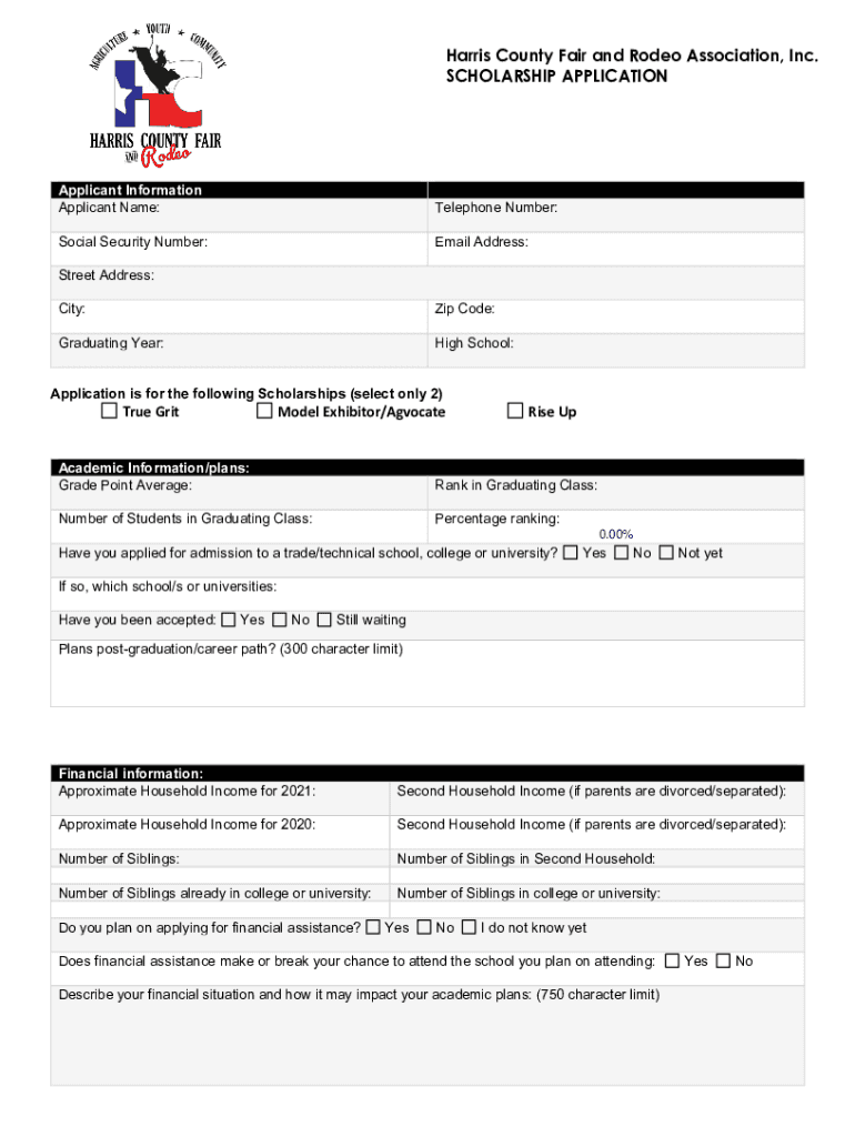 Harris County Fair and Rodeo Association, Inc. SCHOLARSHIP APPLICATIONApplicant Information Applicant Name:Telephone Number:Social Security Number:Email Address:Street Address: City:Zip Code:Graduating