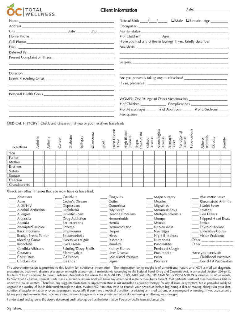Client Information Name ___ Address ___ City ___ State ___ Zip ___ Home Phone ___ Cell Phone ___ Email ___ Referred By ___ Present Complaint or Illness ______ ___ Duration ___ Events Preceding Onset