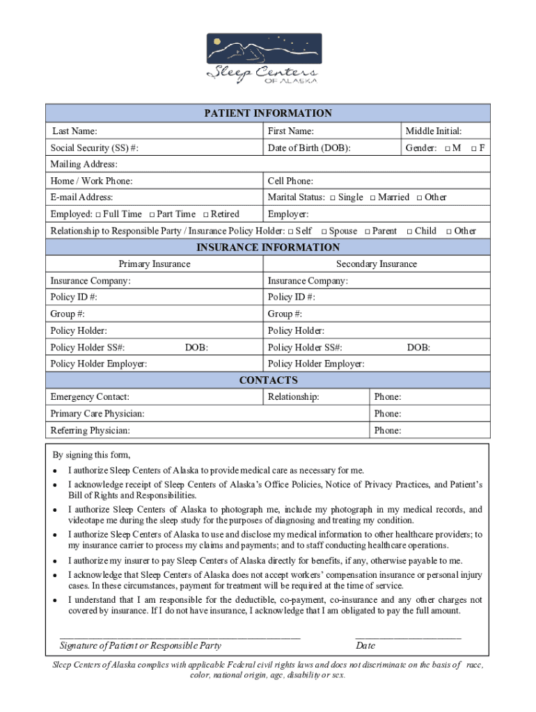 PATIENT INFORMATION Last Name:First Name:Middle Initial:Social Security (SS) #:Date of Birth (DOB):Gender: MFM ailing Address: Home / Work Phone:Cell Phone:Email Address:Marital Status: Single Married