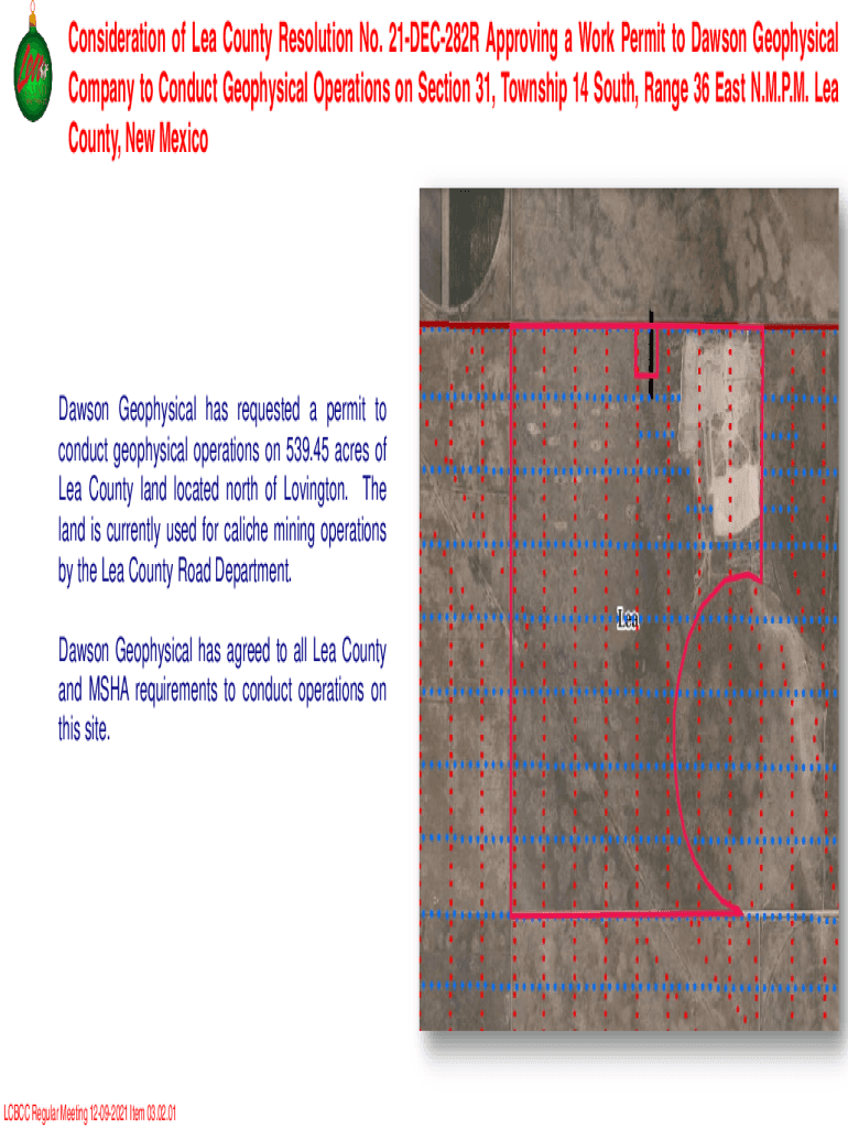 Consideration of Lea County Resolution No. 21DEC282R Approving a Work Permit to Dawson Geophysical Company to Conduct Geophysical Operations on Section 31, Township 14 South, Range 36 East N.M.P.M.