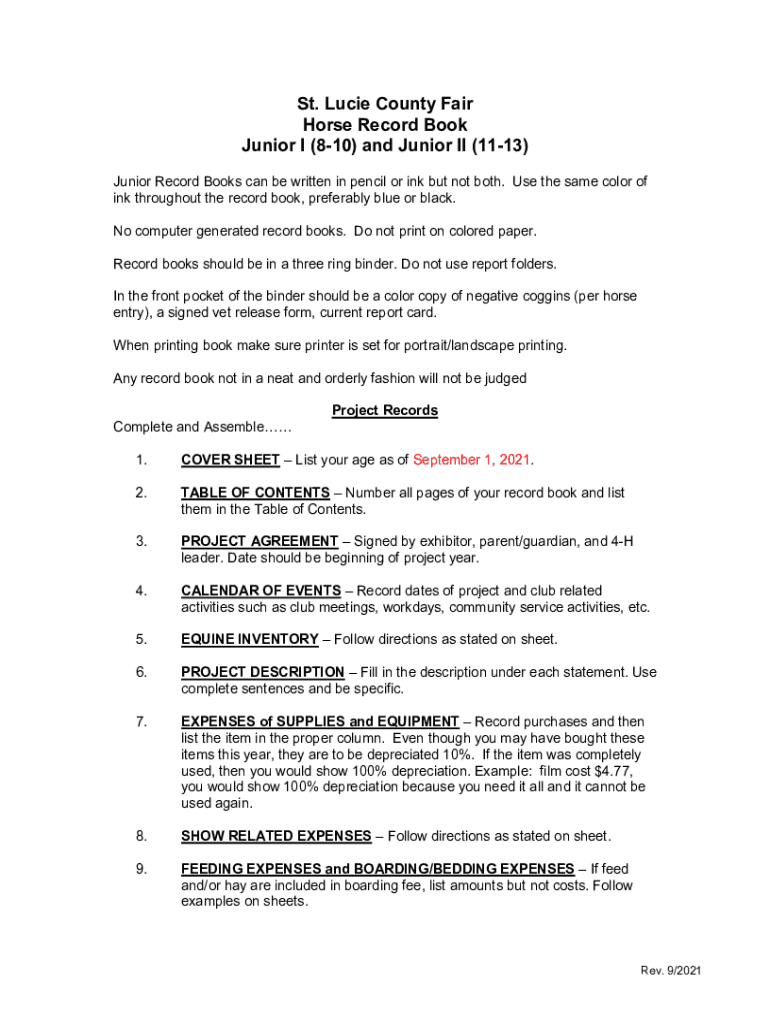 St. Lucie County Fair Horse Record Book Junior I (810) and Junior II (1113) Junior Record Books can be written in pencil or ink but not both. Use the same color of ink throughout the record book,