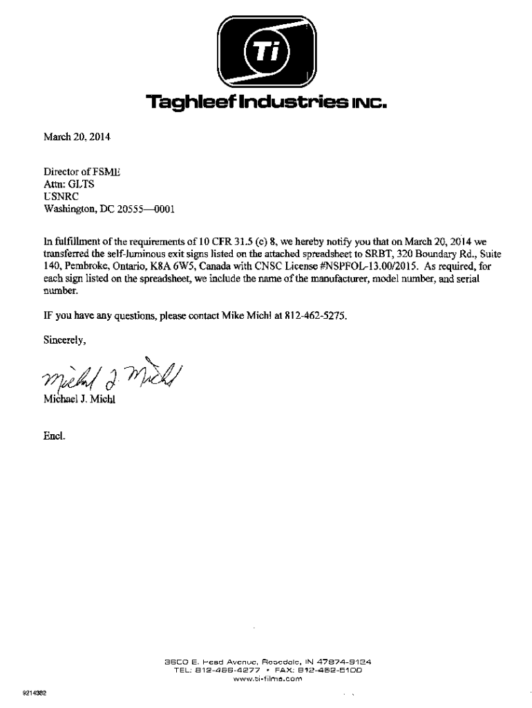 Kathleen Industries INC. March 20, 2014, Director of FAME Attn: GETS US NRC Washington, DC 205550001 In fulfillment of the requirements of 10 CFR 31.5 (c) 8, we hereby notify you that on March 20,
