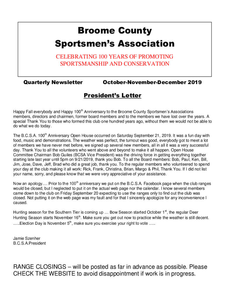 Brooke County Sportsmen Association CELEBRATING 100 YEARS OF PROMOTING SPORTSMANSHIP AND CONSERVATION Foley Road, Newsletter Binghamton New York Since 1919 Quarterly OctoberNovemberDecember 2019Presidents
