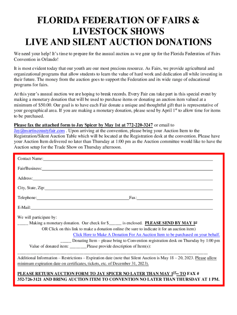 FLORIDA FEDERATION OF FAIRS & LIVESTOCK SHOWS LIVE AND SILENT AUCTION DONATIONS We need your help! It's time to prepare for the annual auction as we gear up for the Florida Federation of Fairs Convention