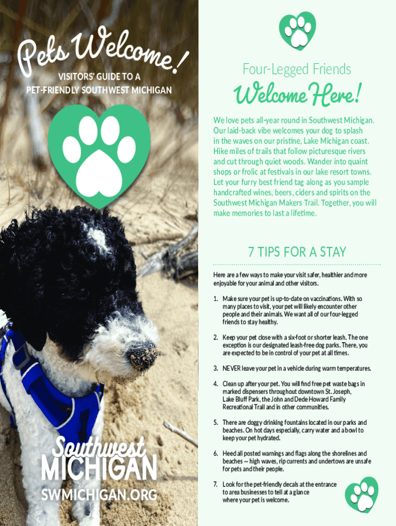 E l W c o m s t e! E P VISITORS\' GUIDE TO A PET-FRIENDLY SOUTHWEST MICHIGANFourLegged FriendsWelcome Here! We love pets all year round in Southwest Michigan. Our laid back vibe welcomes your dog